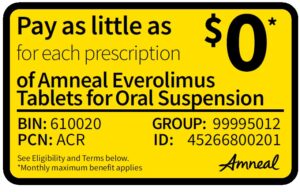 To Patient: Commercially insured patients can use this copay card to reduce out-of-pocket expenses on eligible prescriptions filled with Amneal Everolimus Tablets for Oral Suspension. Mention this offer to your pharmacy along with a valid everolimus tablets for oral suspension prescription for an FDA-approved use. A monthly and yearly maximum savings benefit applies. By using this offer, you acknowledge that you meet the Eligibility Criteria and will comply with the Terms and Conditions set forth below.